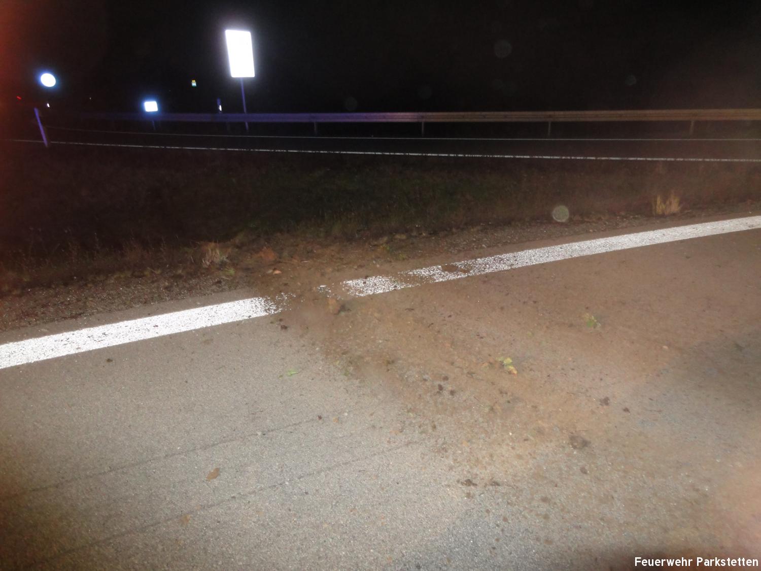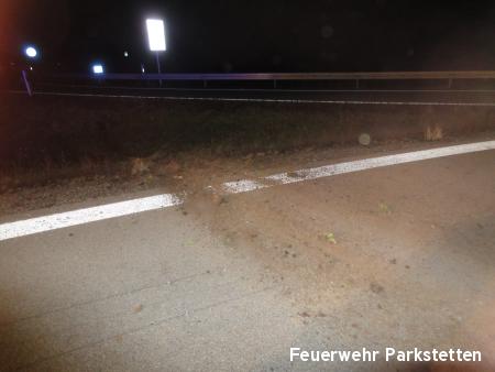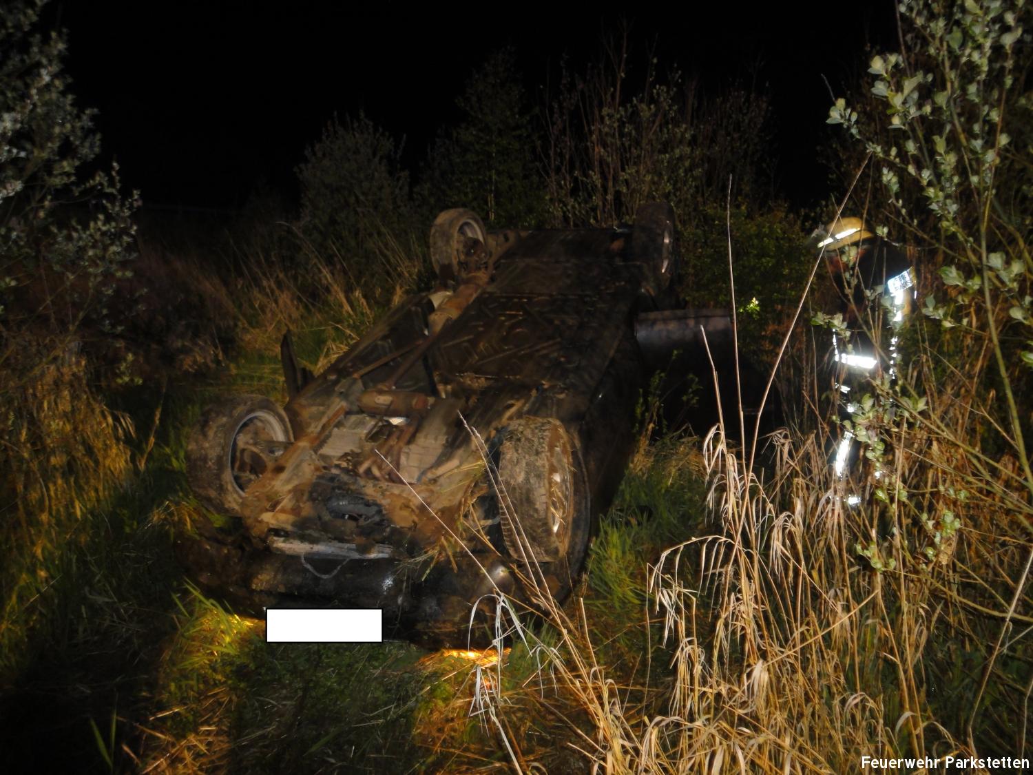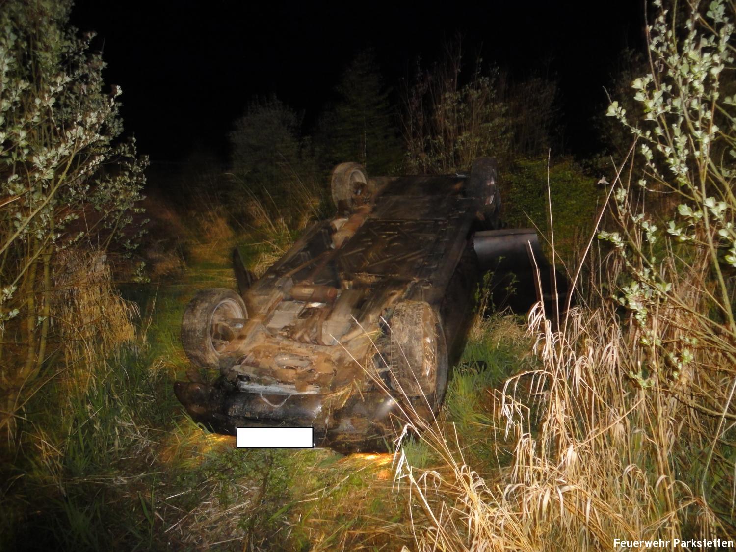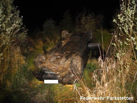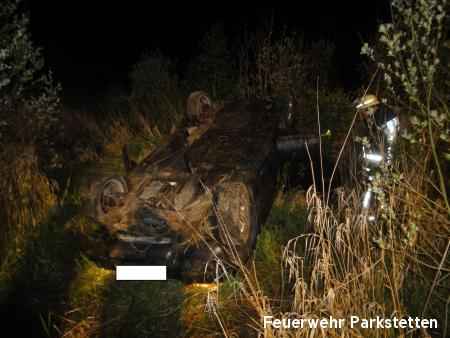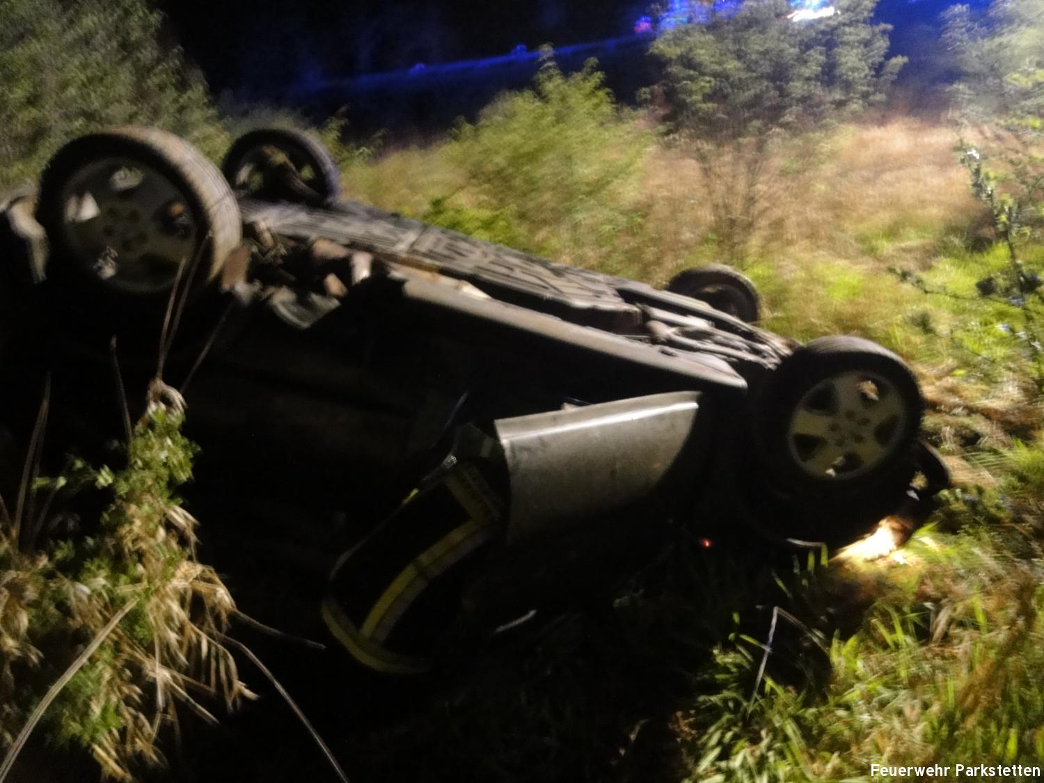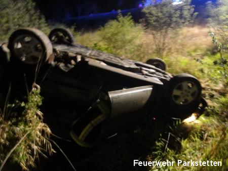 Zu einem Pkw Überschlag wurden wir am Freitagabend auf die B20 zwischen Parkstetten und der Auffahrt zur BAB 3 alarmiert. Beim Eintreffen an der Einsatzstelle stellte sich heraus, das ein Pkw der in Fahrtrichtung Cham unterwegs war, aus bisher ungeklärter Ursache auf Höhe der Auffahrt zur BAB 3 von der Fahrbahn abkam und über die Leitplanke katapultiert wurde. Der Pkw blieb im Kleeblatt in 10 Meter tiefe auf dem Dach liegen. Der Insasse konnte sich selbst aus seinem Fahrzeug befreien, er wurde mit leichten Verletzungen in ein umliegendes Krankenhaus gebracht. Aufgabe der Feuerwehr war es die Unfallstelle nach weiteren verletzten Personen abzusuchen, die Unfallstelle auszuleuchten sowie den Verkehr an der Einsatzstelle zu regeln.