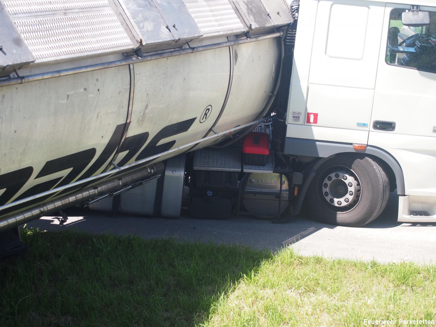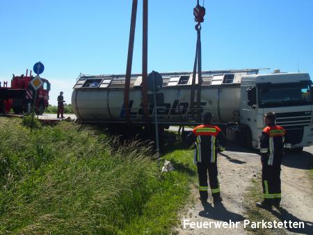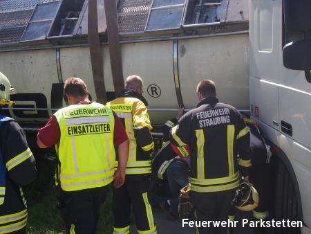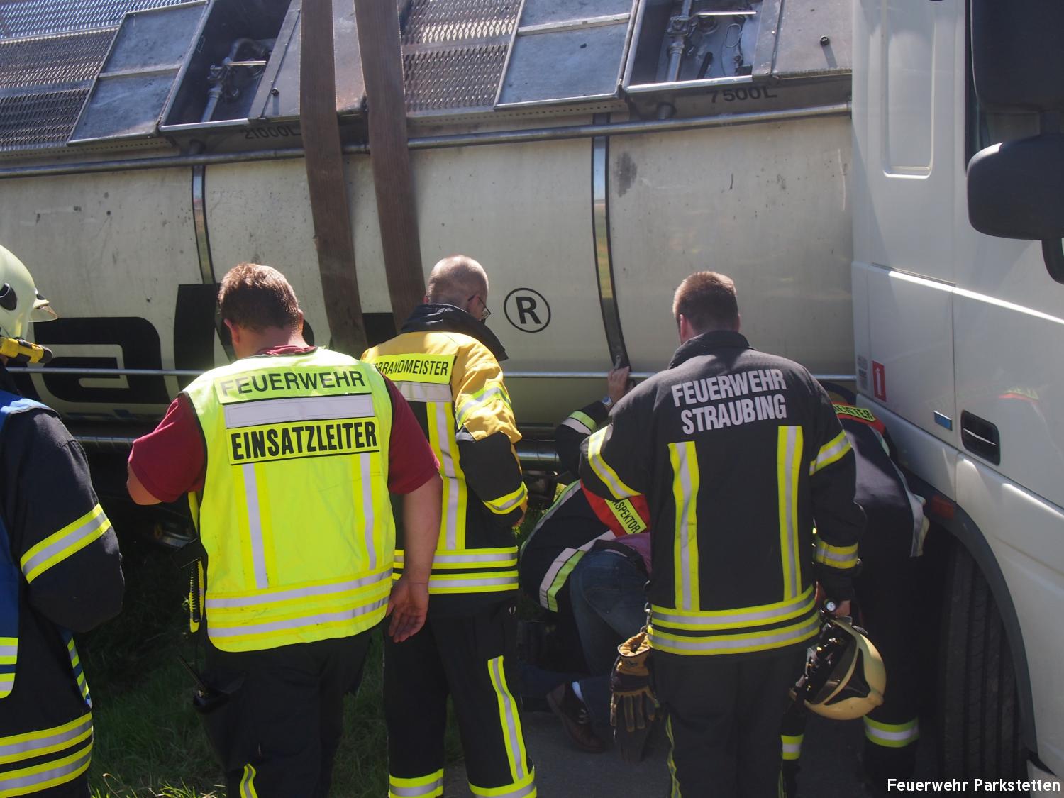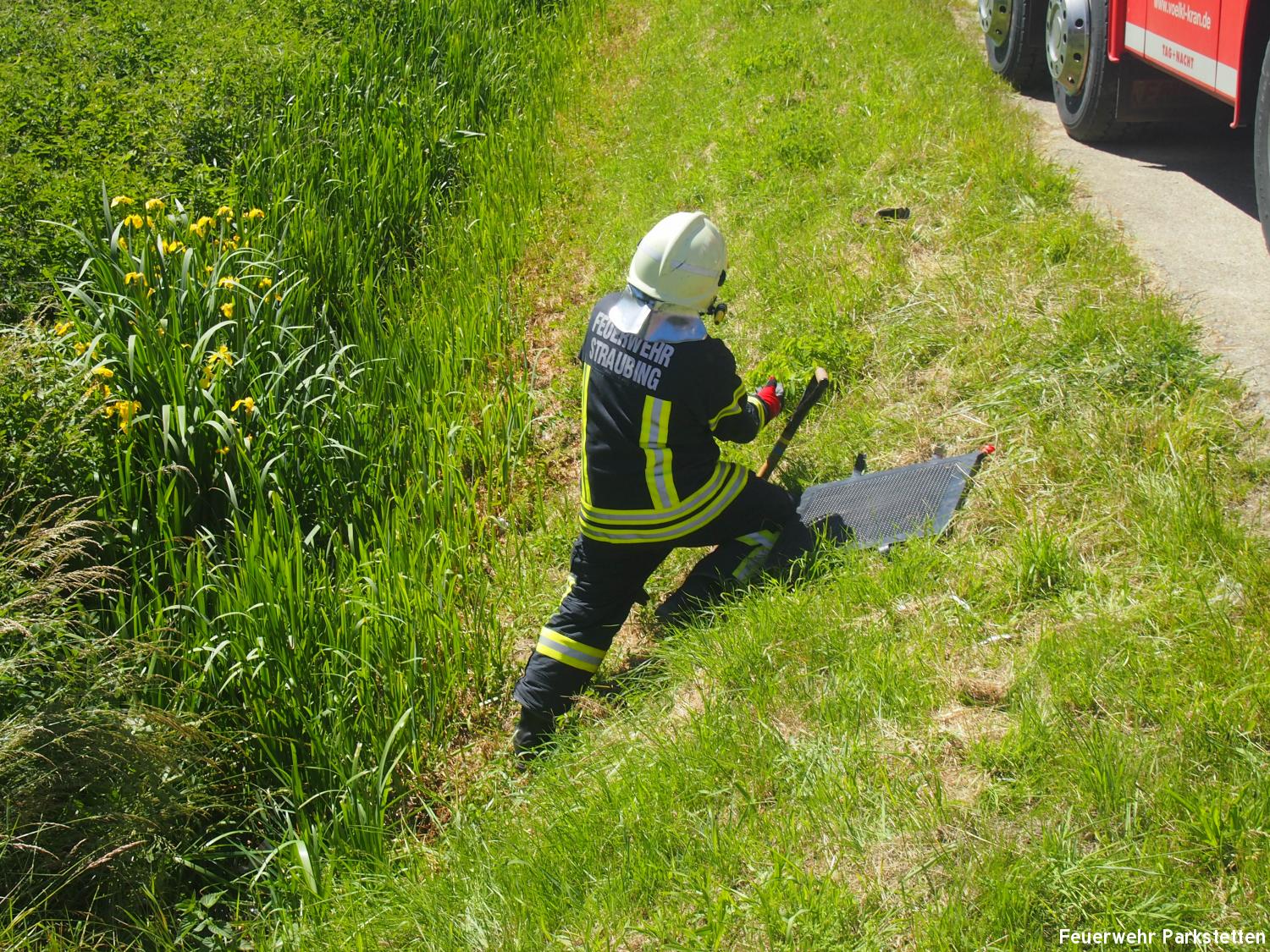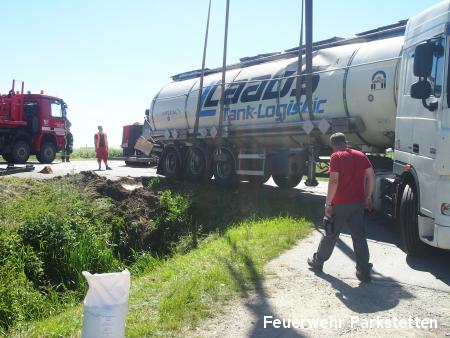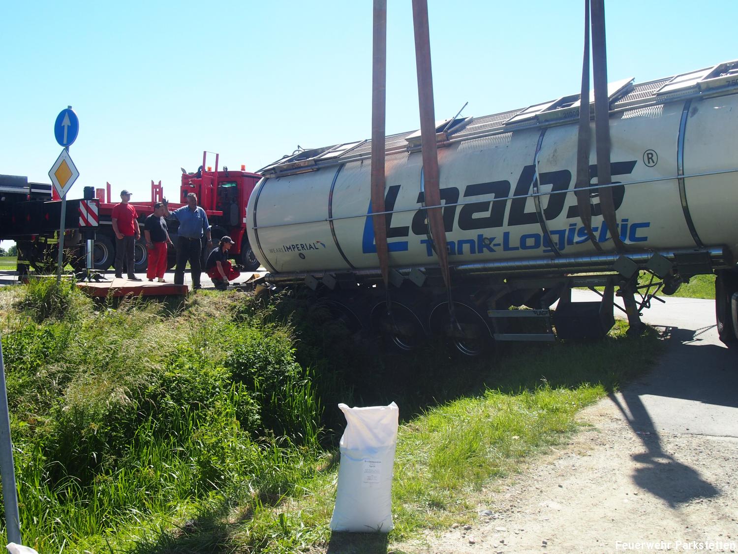 Zur Verkehrslenkung nach einem Lkw Unfall wurden wir am Freitagnachmittag auf die St. 2125 alarmiert. Beim Eintreffen am Einsatzort stellte sich folgende Lage dar. Aus bisher ungeklärter Ursache bog ein Lkw beladen mit einer zähflüssigen Masse von der St. 2125 auf einem Feldweg ab. Dabei rutschte der Auflieger des Lkws während des Abbiegevorgangs in den angrenzenden Graben. Zum Glück wurde der Auflieger nicht so beschädigt das etwas von der Masse auslief. Der Fahrer blieb unverletzt. Aufgabe der Feuerwehr war es bis zur Bergung des Lkws den Verkehr an der Einsatzstelle zu regeln. Während der Bergung war die St 2125 zwischen Thurnhof und der Auffahrt B20 in beiden Richtungen komplett gesperrt. Dazu wurde die Feuerwehr Reibersdorf nachalarmiert. Die FF Straubing hatte derweil in einem Entwässerungsgraben einen Kanaldeckel abgedichtet, sollte bei der Bergung die Masse auslaufen das diese nicht in die Kanalisation läuft. Gegen 16:45 Uhr war der Lkw geborgen, somit konnte die Vollsperre wieder aufgehoben werden und die Feuerwehren wieder einrücken.