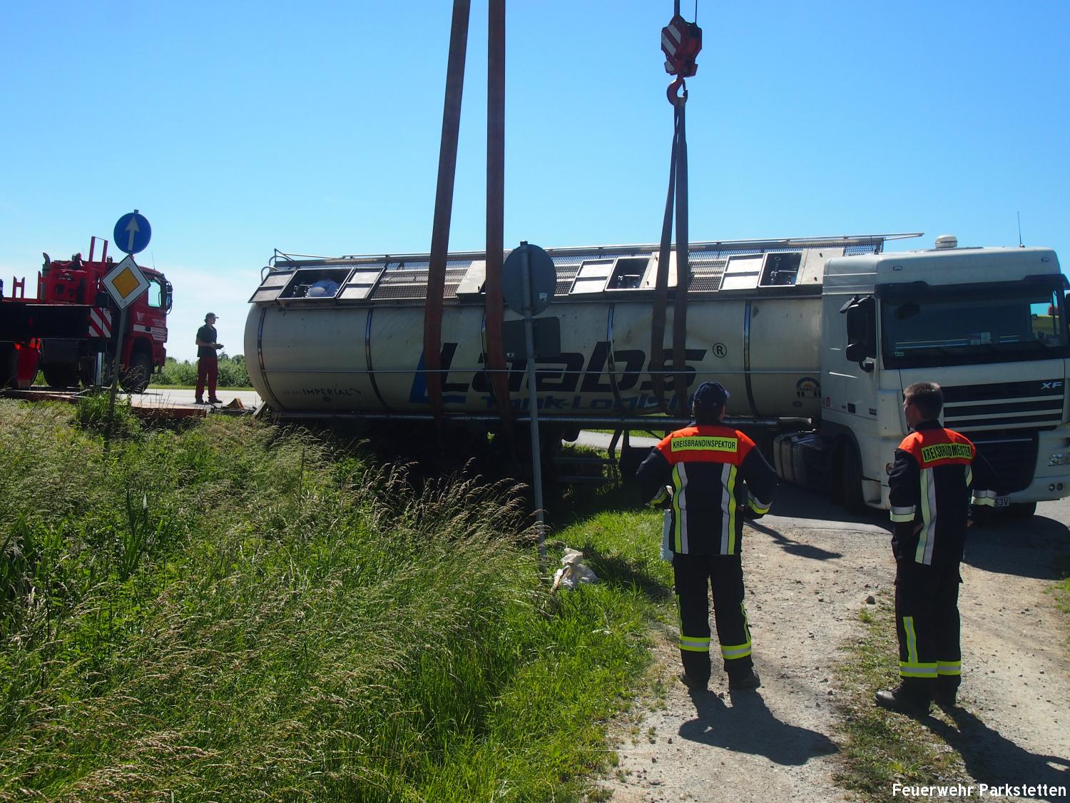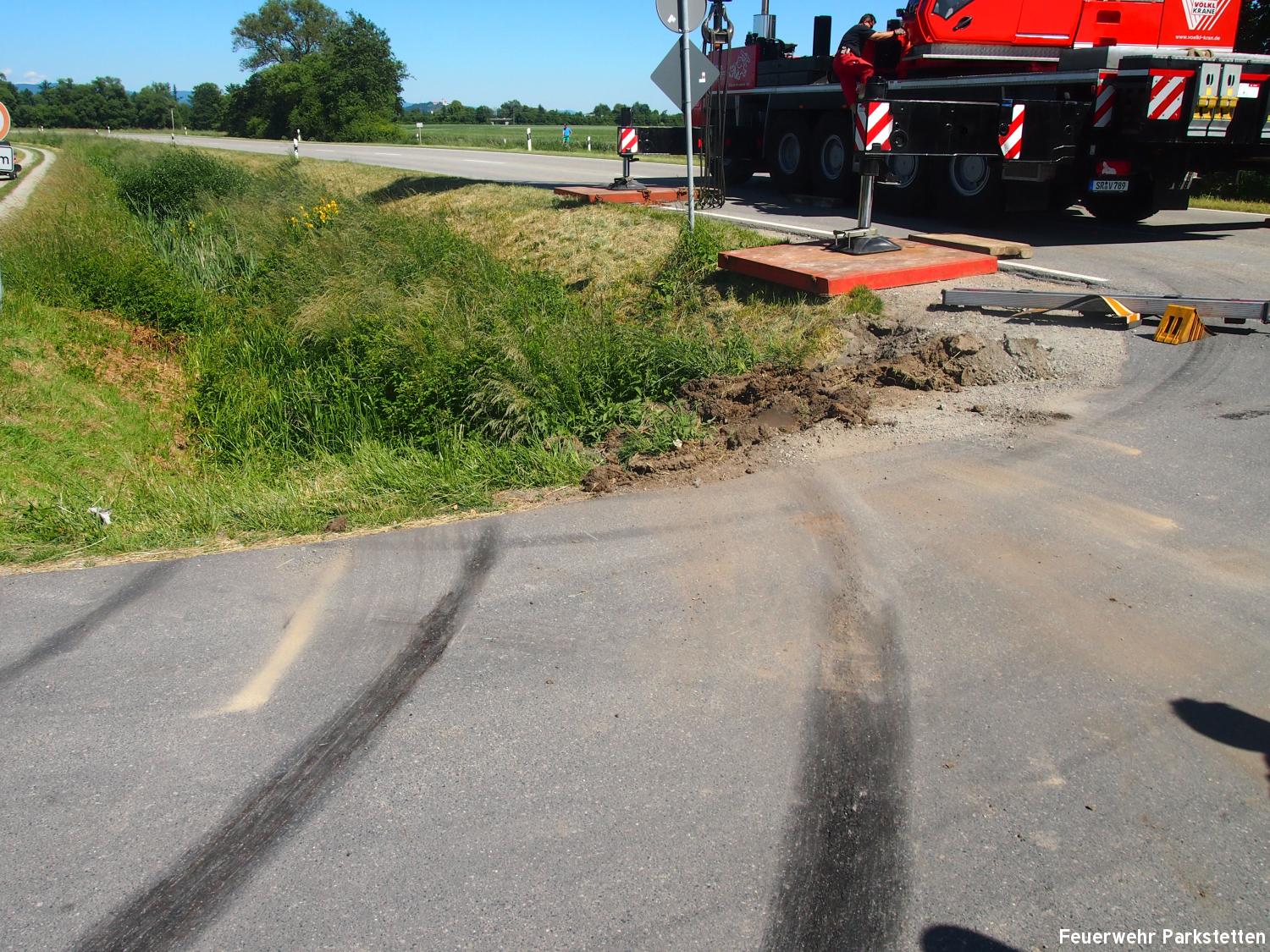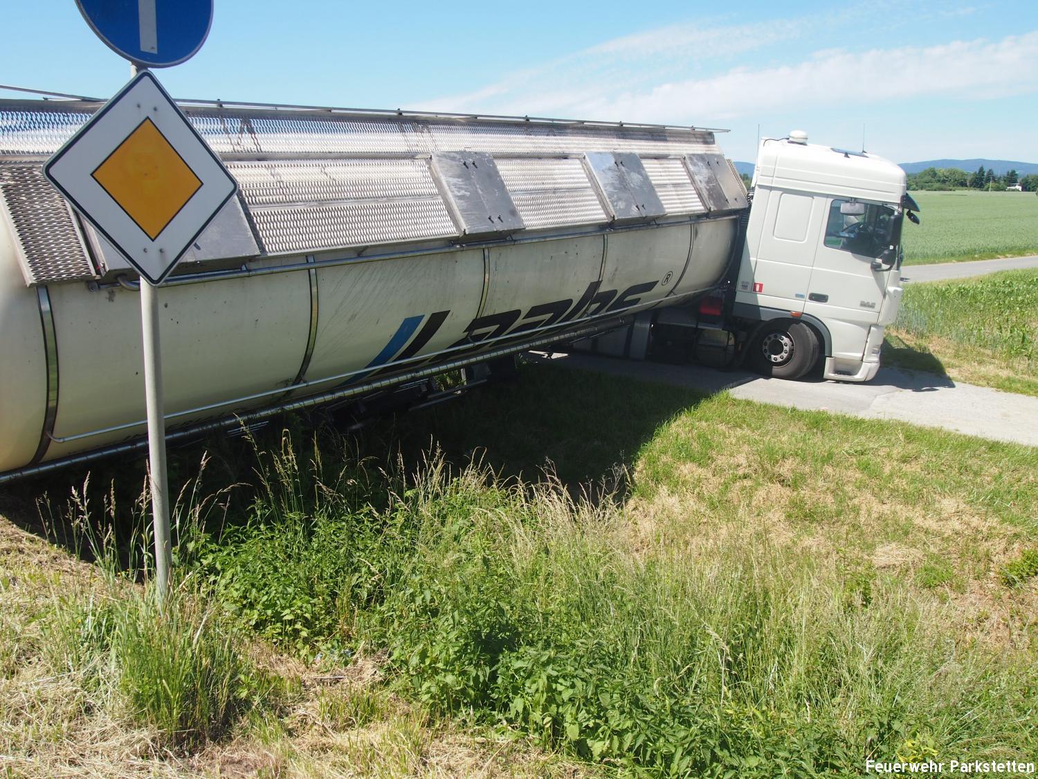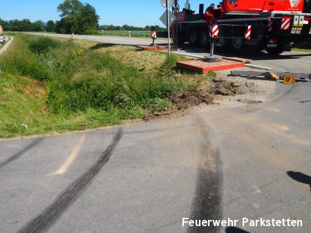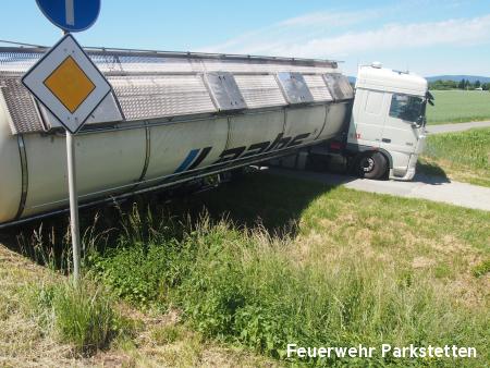 Zur Verkehrslenkung nach einem Lkw Unfall wurden wir am Freitagnachmittag auf die St. 2125 alarmiert. Beim Eintreffen am Einsatzort stellte sich folgende Lage dar. Aus bisher ungeklärter Ursache bog ein Lkw beladen mit einer zähflüssigen Masse von der St. 2125 auf einem Feldweg ab. Dabei rutschte der Auflieger des Lkws während des Abbiegevorgangs in den angrenzenden Graben. Zum Glück wurde der Auflieger nicht so beschädigt das etwas von der Masse auslief. Der Fahrer blieb unverletzt. Aufgabe der Feuerwehr war es bis zur Bergung des Lkws den Verkehr an der Einsatzstelle zu regeln. Während der Bergung war die St 2125 zwischen Thurnhof und der Auffahrt B20 in beiden Richtungen komplett gesperrt. Dazu wurde die Feuerwehr Reibersdorf nachalarmiert. Die FF Straubing hatte derweil in einem Entwässerungsgraben einen Kanaldeckel abgedichtet, sollte bei der Bergung die Masse auslaufen das diese nicht in die Kanalisation läuft. Gegen 16:45 Uhr war der Lkw geborgen, somit konnte die Vollsperre wieder aufgehoben werden und die Feuerwehren wieder einrücken.