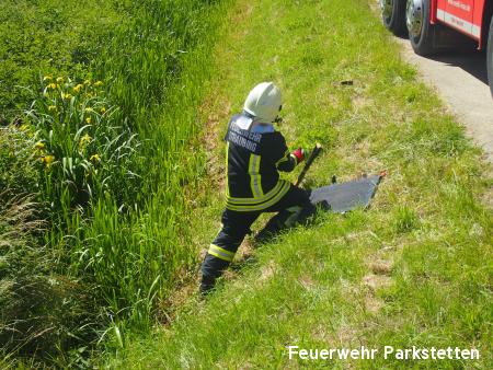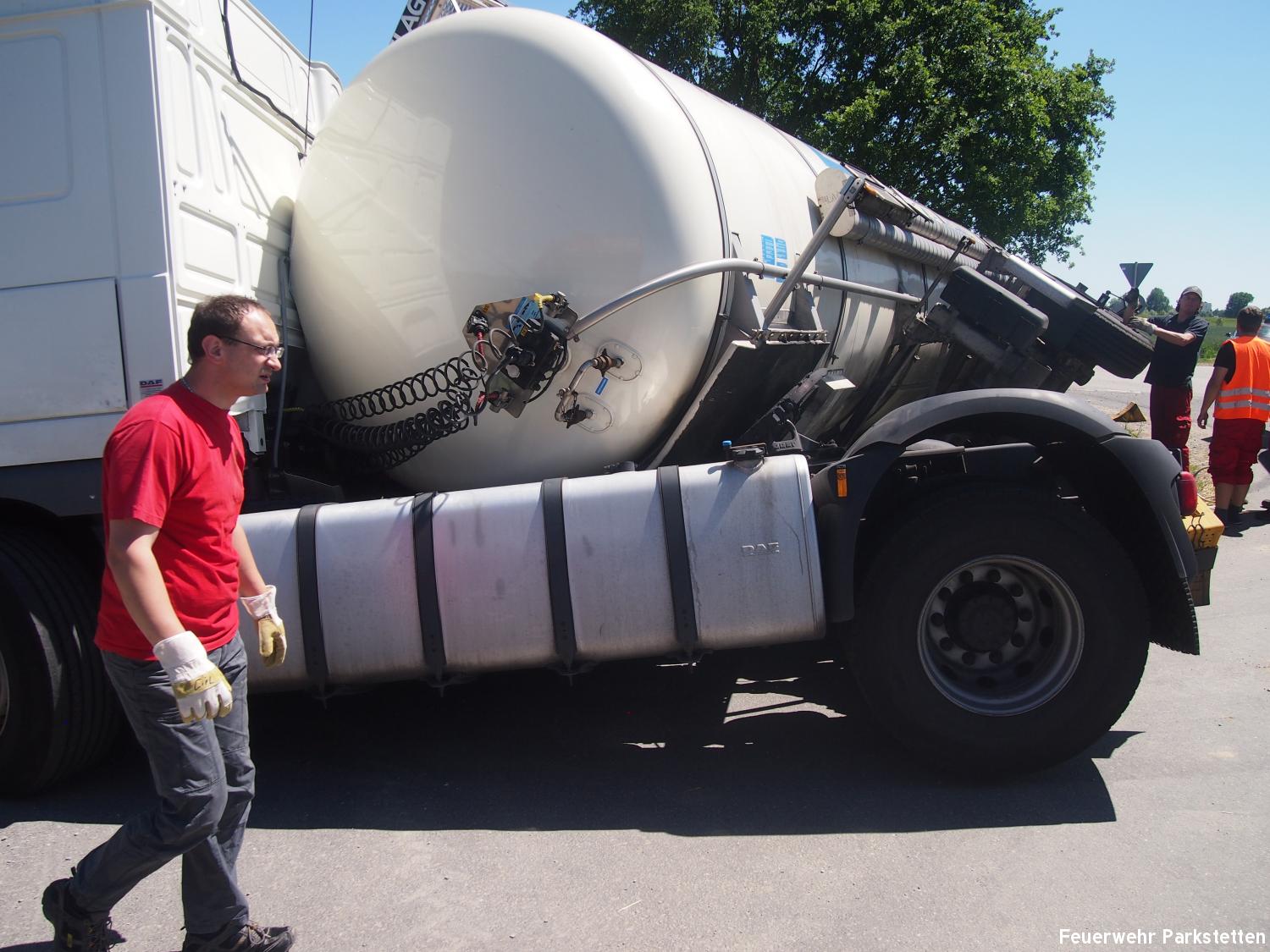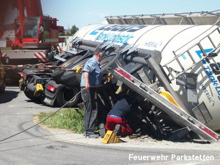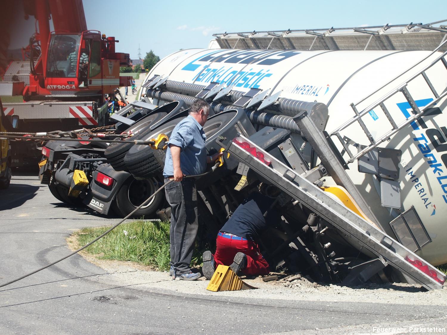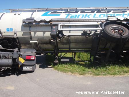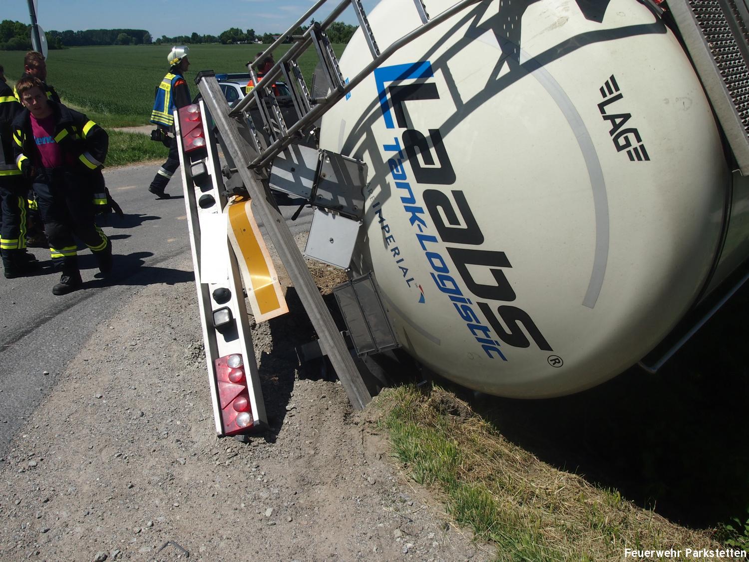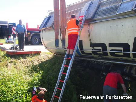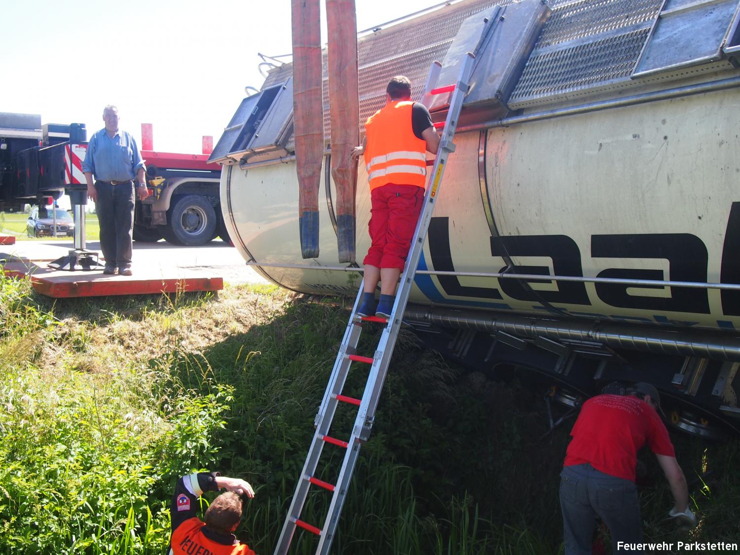 Zur Verkehrslenkung nach einem Lkw Unfall wurden wir am Freitagnachmittag auf die St. 2125 alarmiert. Beim Eintreffen am Einsatzort stellte sich folgende Lage dar. Aus bisher ungeklärter Ursache bog ein Lkw beladen mit einer zähflüssigen Masse von der St. 2125 auf einem Feldweg ab. Dabei rutschte der Auflieger des Lkws während des Abbiegevorgangs in den angrenzenden Graben. Zum Glück wurde der Auflieger nicht so beschädigt das etwas von der Masse auslief. Der Fahrer blieb unverletzt. Aufgabe der Feuerwehr war es bis zur Bergung des Lkws den Verkehr an der Einsatzstelle zu regeln. Während der Bergung war die St 2125 zwischen Thurnhof und der Auffahrt B20 in beiden Richtungen komplett gesperrt. Dazu wurde die Feuerwehr Reibersdorf nachalarmiert. Die FF Straubing hatte derweil in einem Entwässerungsgraben einen Kanaldeckel abgedichtet, sollte bei der Bergung die Masse auslaufen das diese nicht in die Kanalisation läuft. Gegen 16:45 Uhr war der Lkw geborgen, somit konnte die Vollsperre wieder aufgehoben werden und die Feuerwehren wieder einrücken.