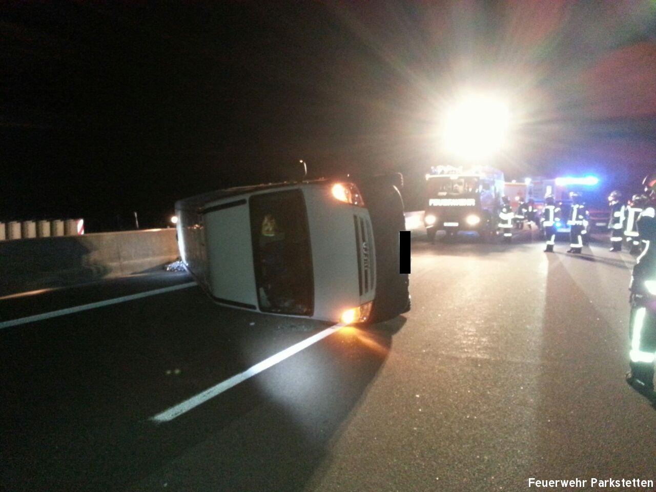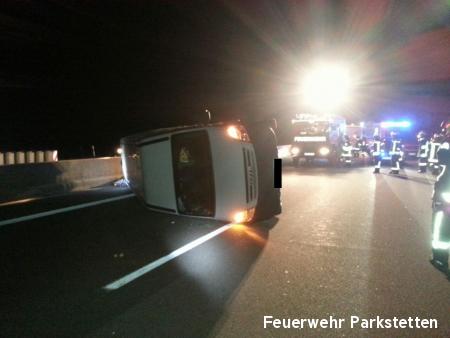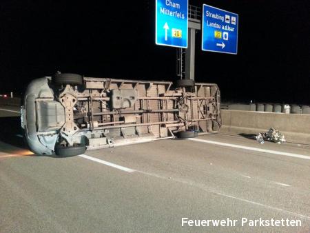 Zu einem Verkehrsunfall wurden wir in der Nacht zum Montag auf die BAB 3 zwischen Kirchroth und Straubing alarmiert. An der Einsatzstelle stellte sich folgende Lage dar. Ein Sprinter der in Fahrtrichtung Passau unterwegs war kam aus bisher ungeklärter Ursache auf Höhe der Ausfahrt Straubing ins Schleudern und kam auf der Beifahrerseite zum liegen. Die 3 Insassen des Sprinters konnten alle eigenständig das Fahrzeug verlassen. 2 Personen kamen verletzt in umliegende Krankenhäuser. Der 3 Insasse des Sprinters blieb bei dem Unfall unverletzt. Aufgabe der Feuerwehren war es u.a. den Brandschutz an der Unfallstelle sicherzustellen, das ausleuchten der Unfallstelle sowie mit Hilfe des VSA den Verkehr an der Unfallstelle zu regeln. Die Autobahn war bis um ca. 4 Uhr bei der Ausfahrt Straubing in Fahrtrichtung Passau komplett gesperrt.