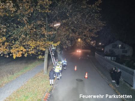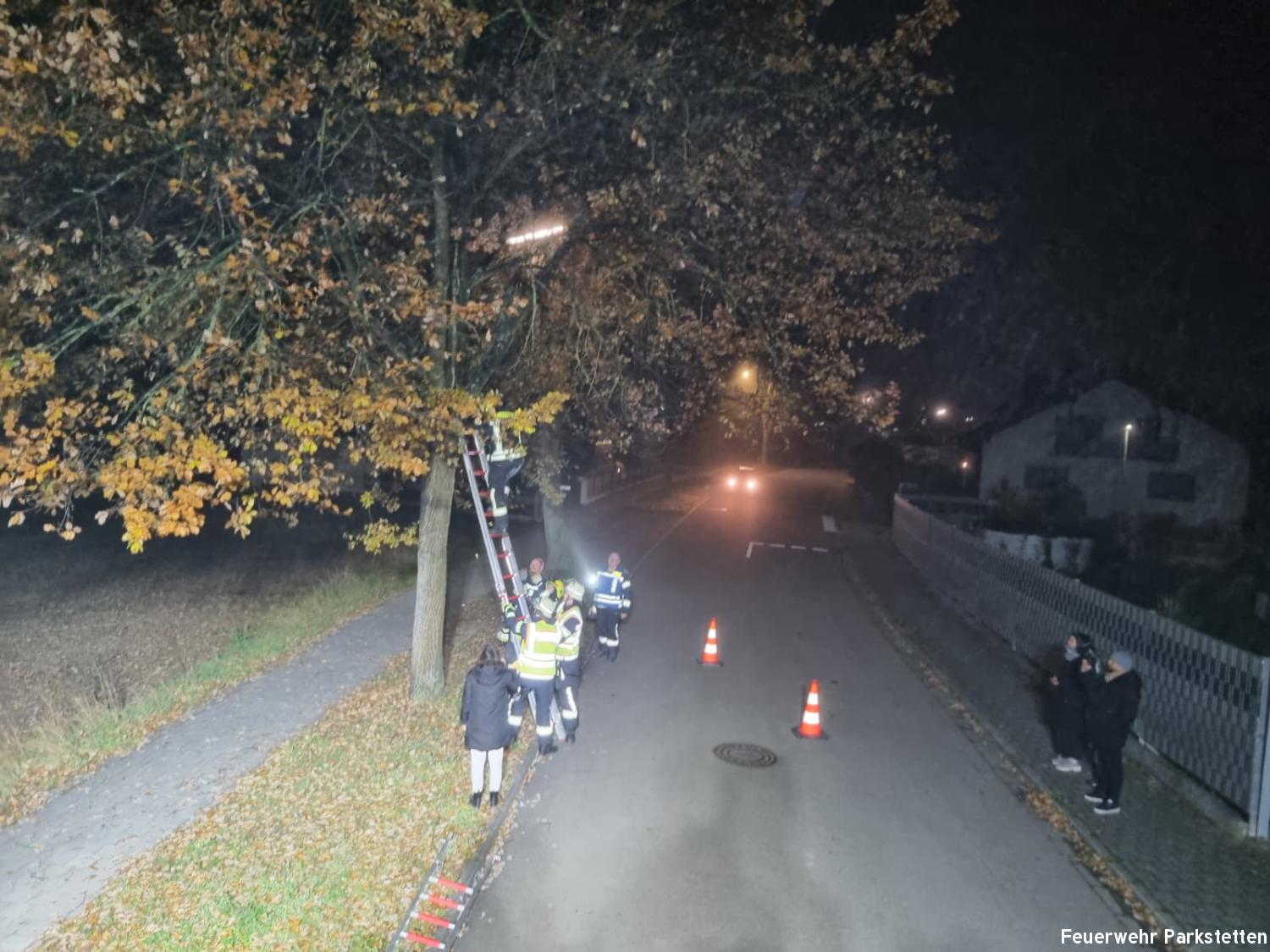 Am Freitag, 07.11.25 gegen 19:30 wurde die FF Parkstetten durch Passanten privat verständigt, dass sich in der Schulstraße seit geraumer Zeit ein junge Katze auf einem hohen Baum befindet und sich wohl nicht mehr runter traut. Nach Überprüfung durch eine Führungskraft konnte dieser Sachverhalt bestätigt werden. In der Zwischenzeit waren bereits einige Feuerwehrdienstleistende am Gerätehaus und so rückten wir zur Einsatzstelle aus. Nach Absicherung der Einsatzstelle und Herstellen der Beleuchtung wurde die Katze mittels einer Steckleiter durch einen Feuerwehrangehörigen aus der Baumkrone befreit und auf die Straße herunter gebracht. Wieder auf sicheren Boden suchte die junge Katze das Weite und ist hoffentlich bereits wieder in Ihren Zuhause angekommen.