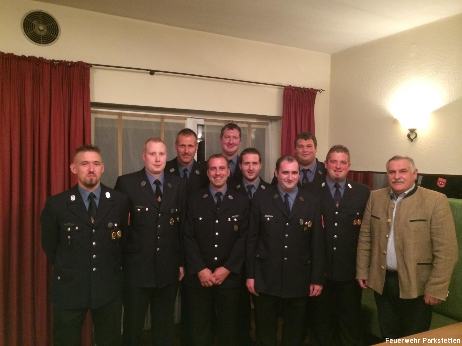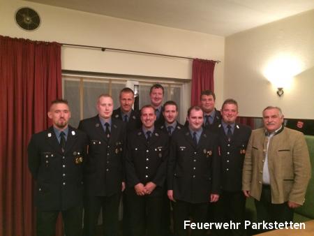 Am Samtagabend des 20.09.2014 fand das Floriansfest der Feuerwehr Parkstetten statt. Um 17:30 besuchten die Mitglieder zusammen den Gottesdienst zum Gedenken an die verstorbenen Mitglieder. Im Anschluß an den Gottesdienst ging es in das Cafe Speiseder. 1. Vorstand Andreas Schindler begrüßte an die 50 Leute und stellte eine kleine Vorausschau auf die nächsten Vereinstermine dar. Im Anschluss fanden Ehrungen und Beförderungen durch den 1. Kommandanten Robert Wacker statt. Zum Löschmeister wurde Thomas Scholtz befördert. Für 10 Jahre aktive Dienstzeit wurden Bonschab Markus, Kagerbauer Klaus, Petznik Erich, Fuchs Mario, Hankofer Florian, Schindler Andreas, Schlecht Fabian, Müller Christoph und Kreipl Andreas geehrt. Im Anschluss an die Ehrungen gab es noch ein gemeinsammes Abendessen. Das Bild zeigt die Geehrten mit den beiden Kommandanten, den beiden Vorständen und dem 1. Bürgermeister Heinrich Krempl