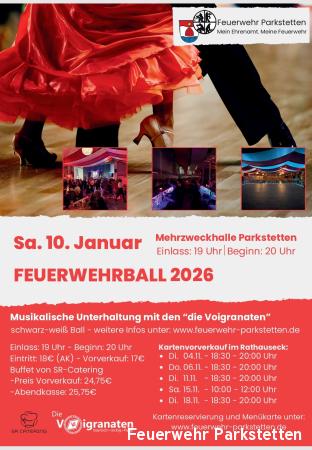 Im kommenden Jahr findet am Samstag, den 10. Januar 2026 wieder der große Feuerwehrball der Freiwilligen Feuerwehr Parkstetten in der Mehrzweckhalle statt. Der Kartenvorverkauf dazu startet am Dienstag 4. November 2025 von 18:30 Uhr bis 20:00 Uhr im Rathauseck. Die Eintrittskarte dazu kostet wie die letzten Jahre auch 17,00 € im Vorverkauf und 18,00 € an der Abendkasse. Auch in diesem Jahr gibt es wieder ein großes Buffet (geschmorte Rinderbackerl, Schweinelendchen in Rahmsoße, gebratene Lachsseite mit Kräutersoße und Steinpilzravioli in Thymian-Butter und Parmesan) vom Team der SR Catering GmbH zum Preis von 24,75 € im Vorverkauf und an der Abendkasse für 25,75 €. Für die musikalische Umrandung sorgen "Die Voigranaten".