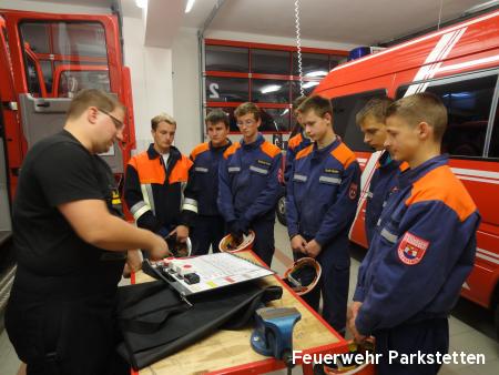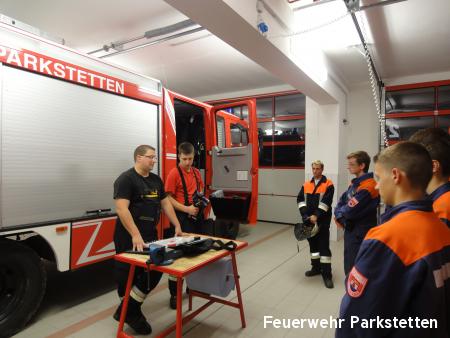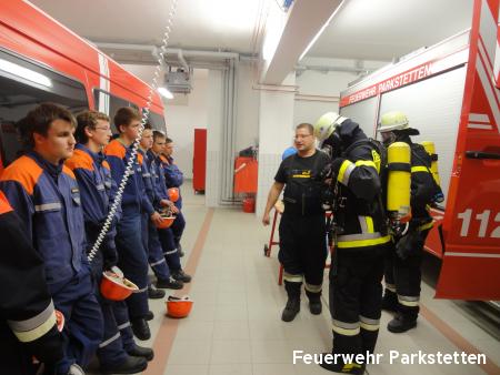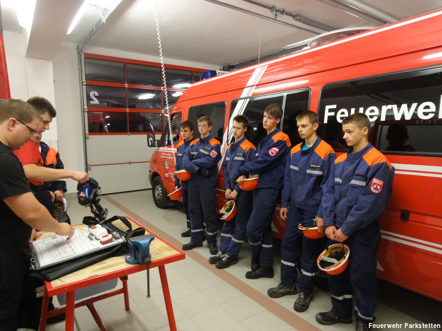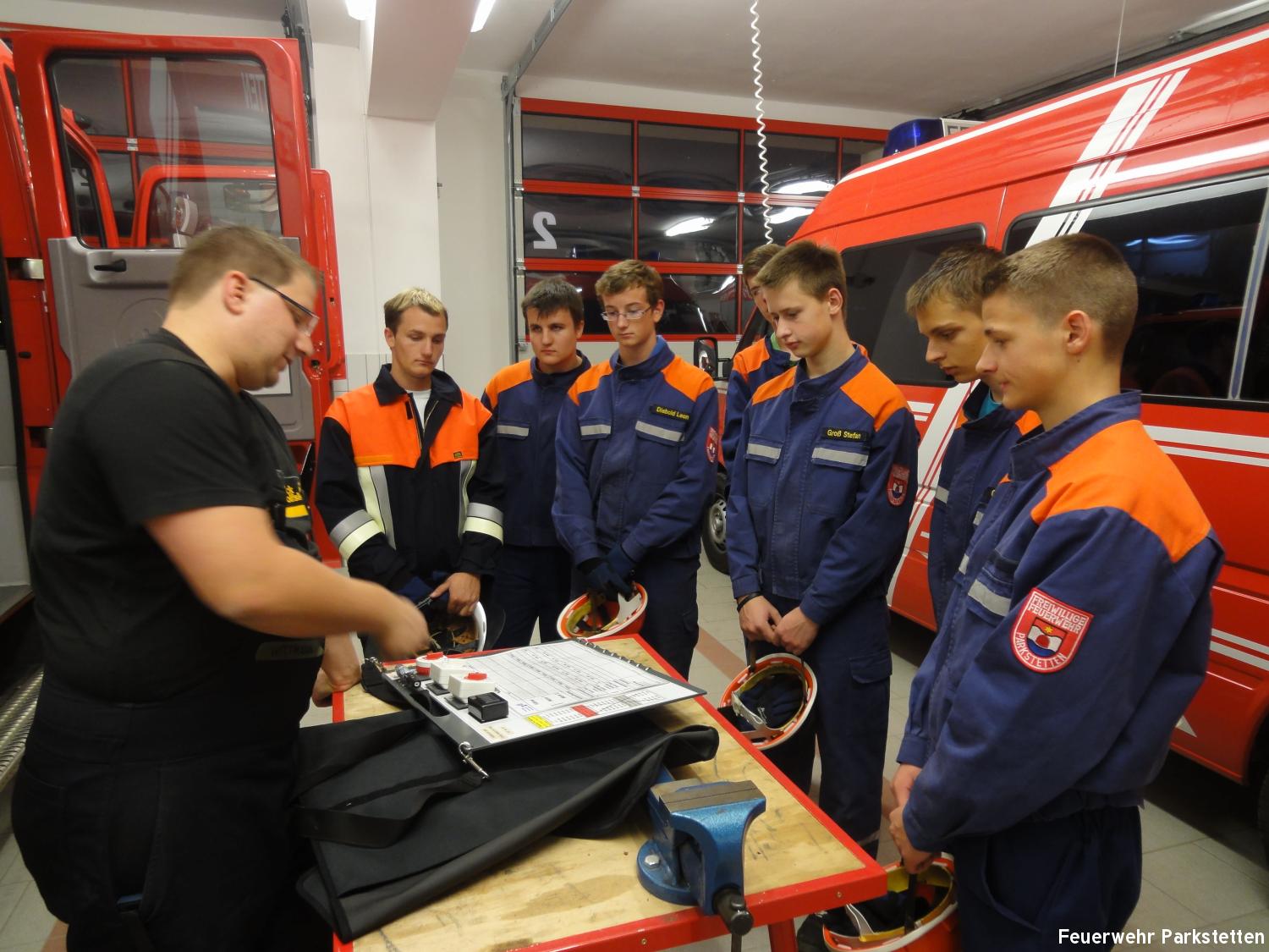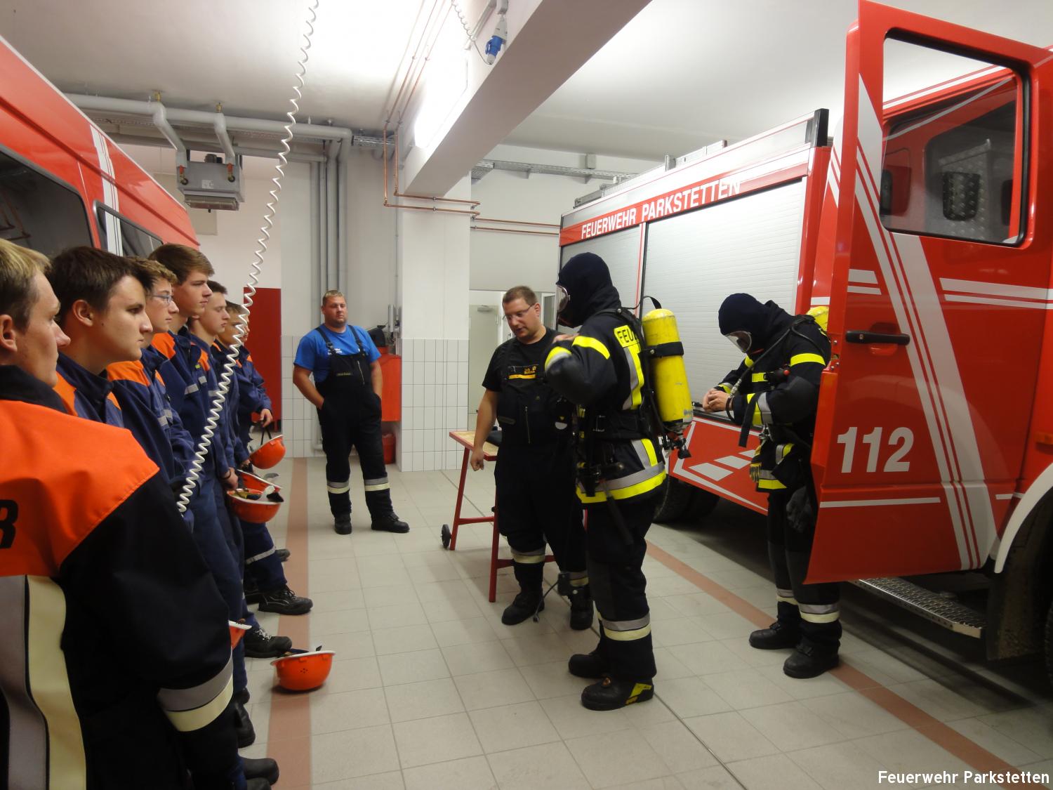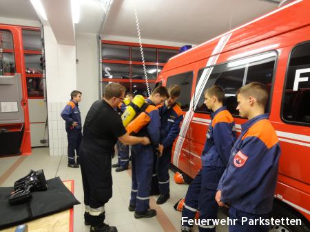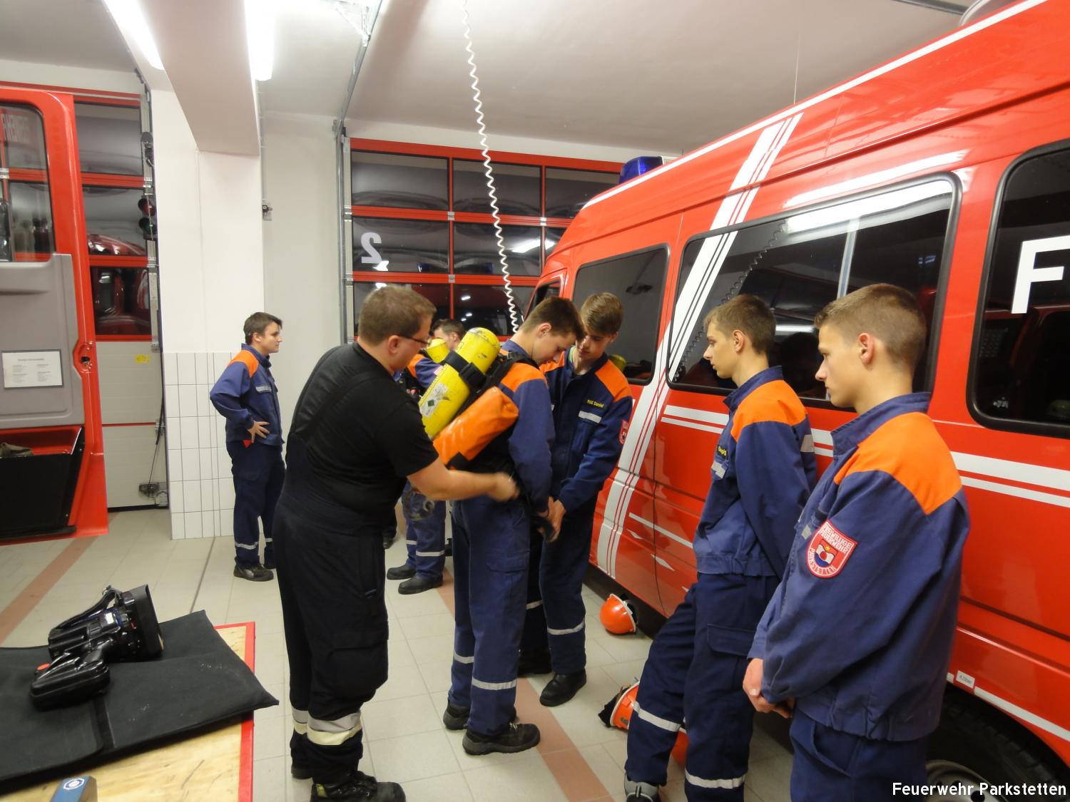 Die alle 3 Wochen stattfindende Jugendausbildung. In dieser Übung wurde den Jugendlichen gezeigt, wie sich ein Atemschutztrupp im Ernstfall ausrüstet, welche Gegenstände sie mit sich führen, sowie das richtige bedienen der Wärmebildkamera und das richte führen der Atemschutzüberwachung. Nach dem den Jugendlichen alles gezeigt wurde durften sie natürlich selbst Hand anlegen, jeder der wollte durfte sich selbst ausrüsten um schon einmal in den Genuß eines Atemschutzgeräteträger zu kommen. Da bei hatte jeder einzelne eine Menge Spaß.